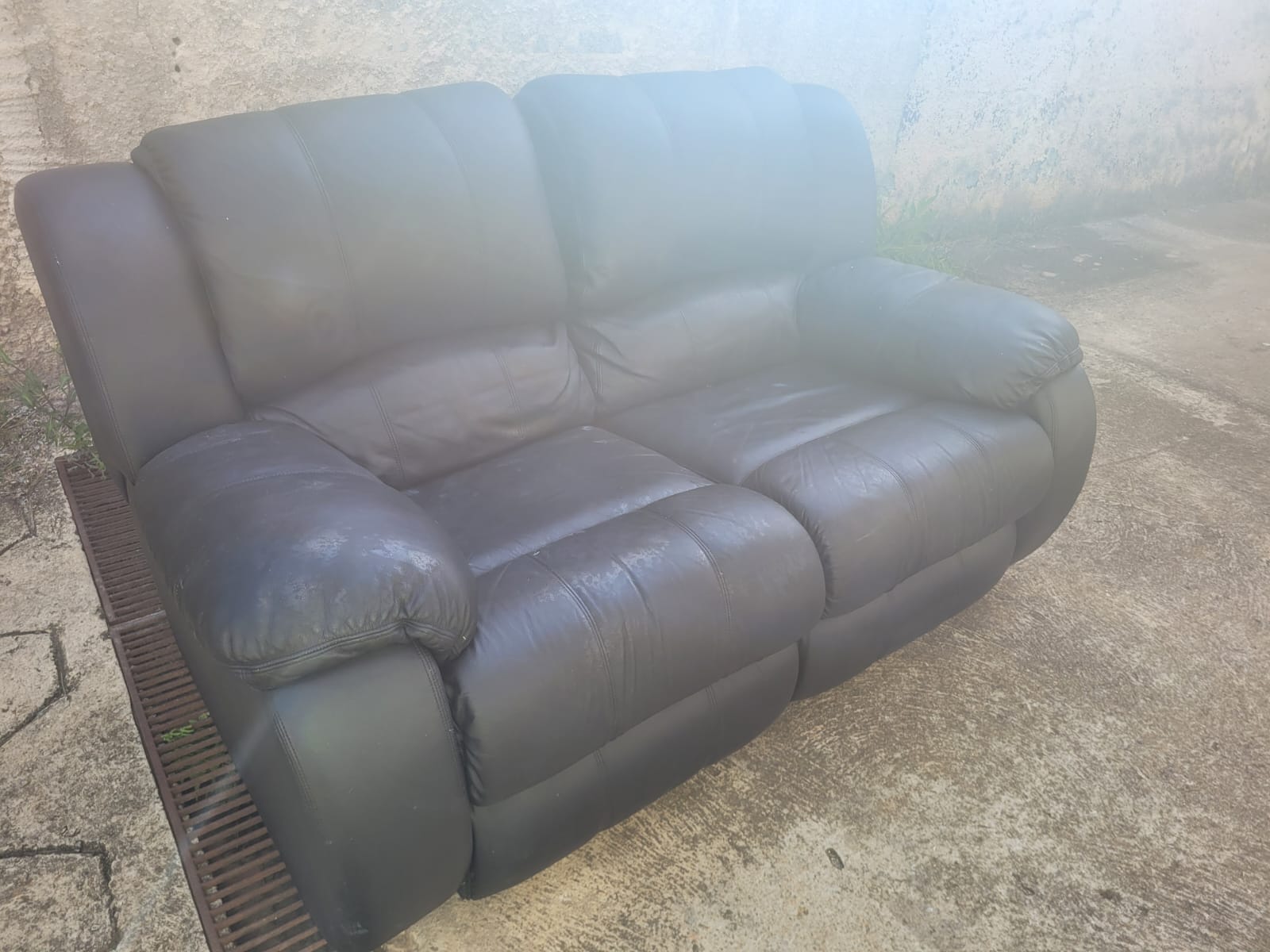 Sofá de 2 lugares em bom estado estrutural, com marcas de uso no revestimento, ideal para revestir ou renovar.